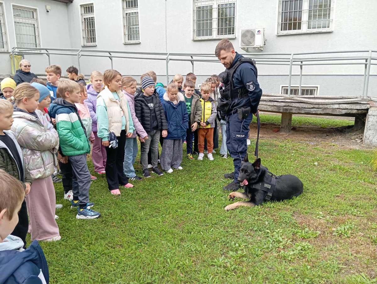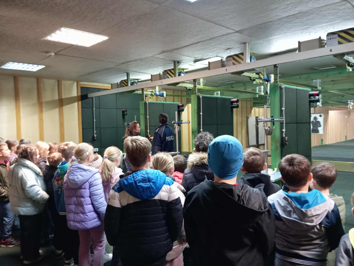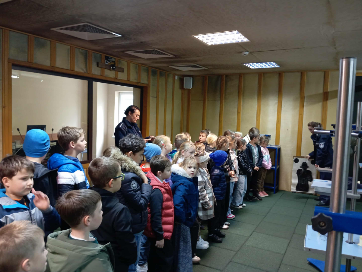 Kolejnym etapem wycieczki była Komenda Powiatowa Policji. Tam na dzieci czekało wiele atrakcji: mogły zobaczyć policyjną furgonetkę, odwiedzić areszt, a także pobrać swoje odciski palców i stanąć do pamiątkowego zdjęcia. Duże wrażenie zrobił pokaz pracy psa policyjnego, który zaprezentował swoje umiejętności wraz z pozorantem. Uczniowie odwiedzili również strzelnicę, poznając zasady bezpieczeństwa obowiązujące podczas szkolenia funkcjonariuszy.