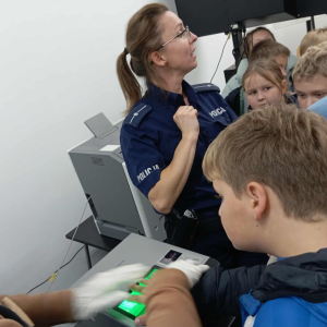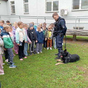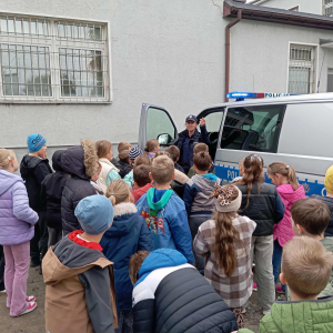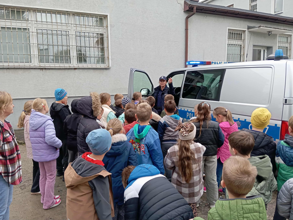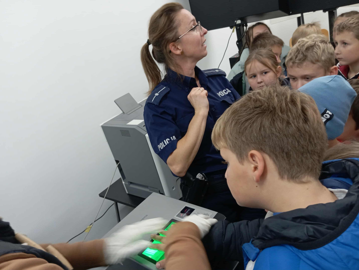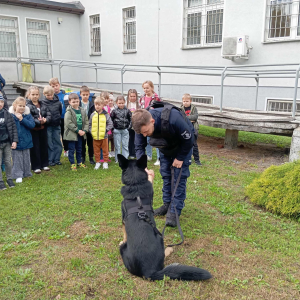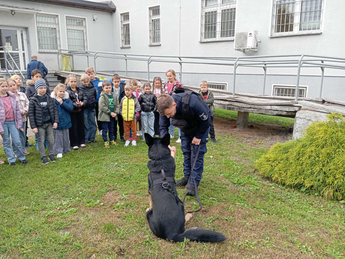 Kolejnym etapem wycieczki była Komenda Powiatowa Policji. Tam na dzieci czekało wiele atrakcji: mogły zobaczyć policyjną furgonetkę, odwiedzić areszt, a także pobrać swoje odciski palców i stanąć do pamiątkowego zdjęcia. Duże wrażenie zrobił pokaz pracy psa policyjnego, który zaprezentował swoje umiejętności wraz z pozorantem. Uczniowie odwiedzili również strzelnicę, poznając zasady bezpieczeństwa obowiązujące podczas szkolenia funkcjonariuszy.