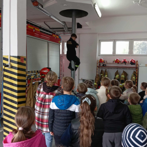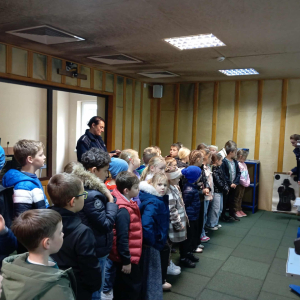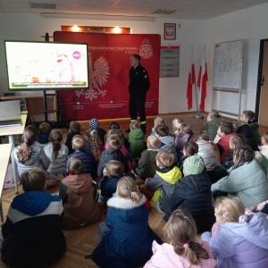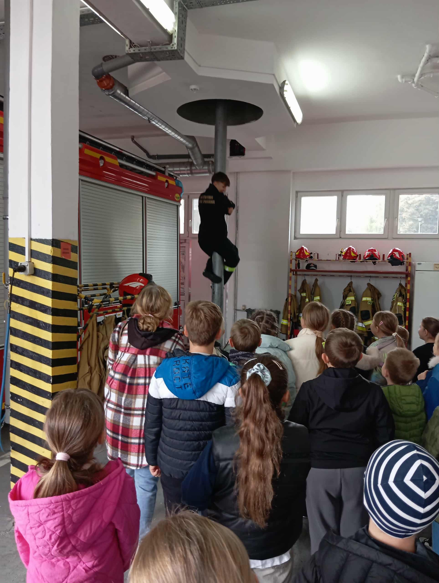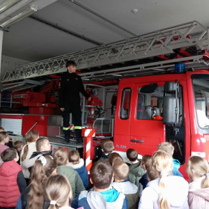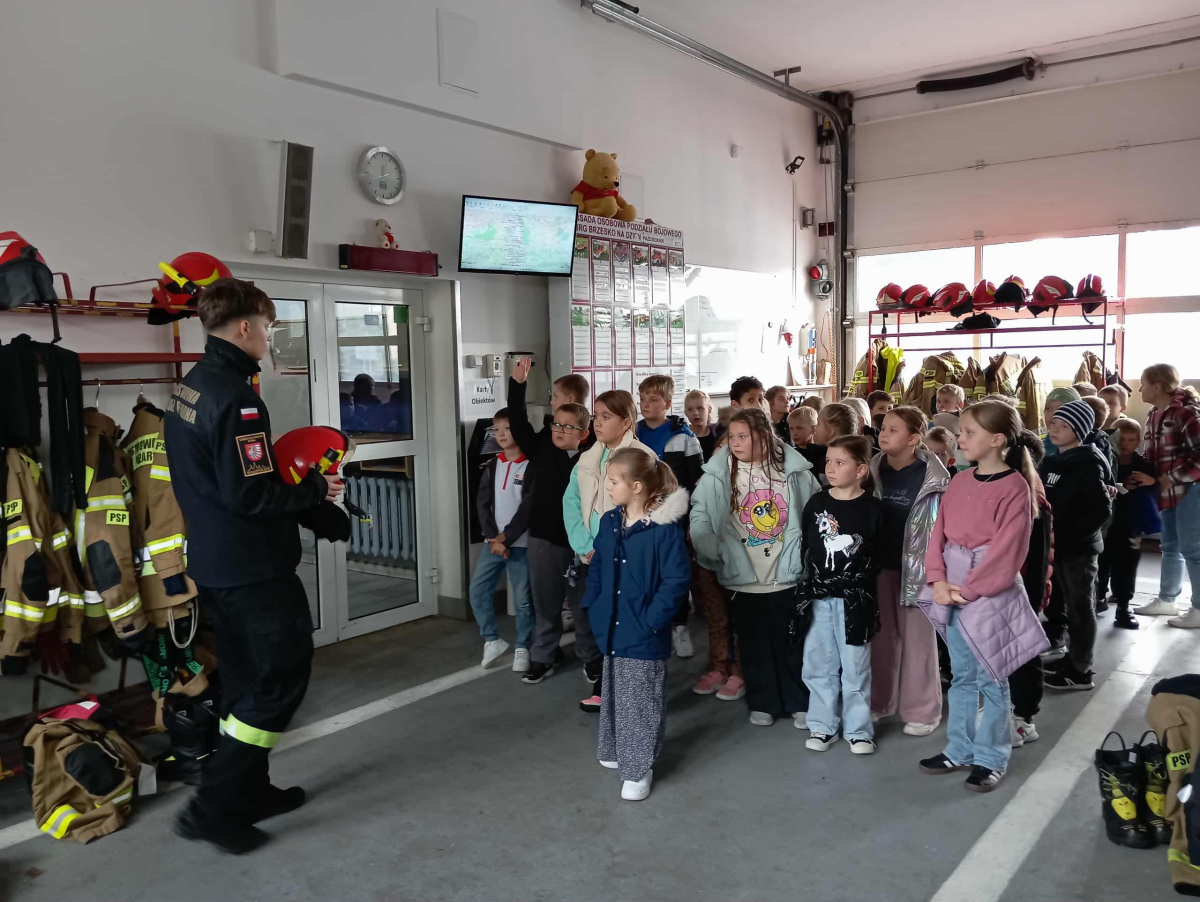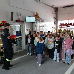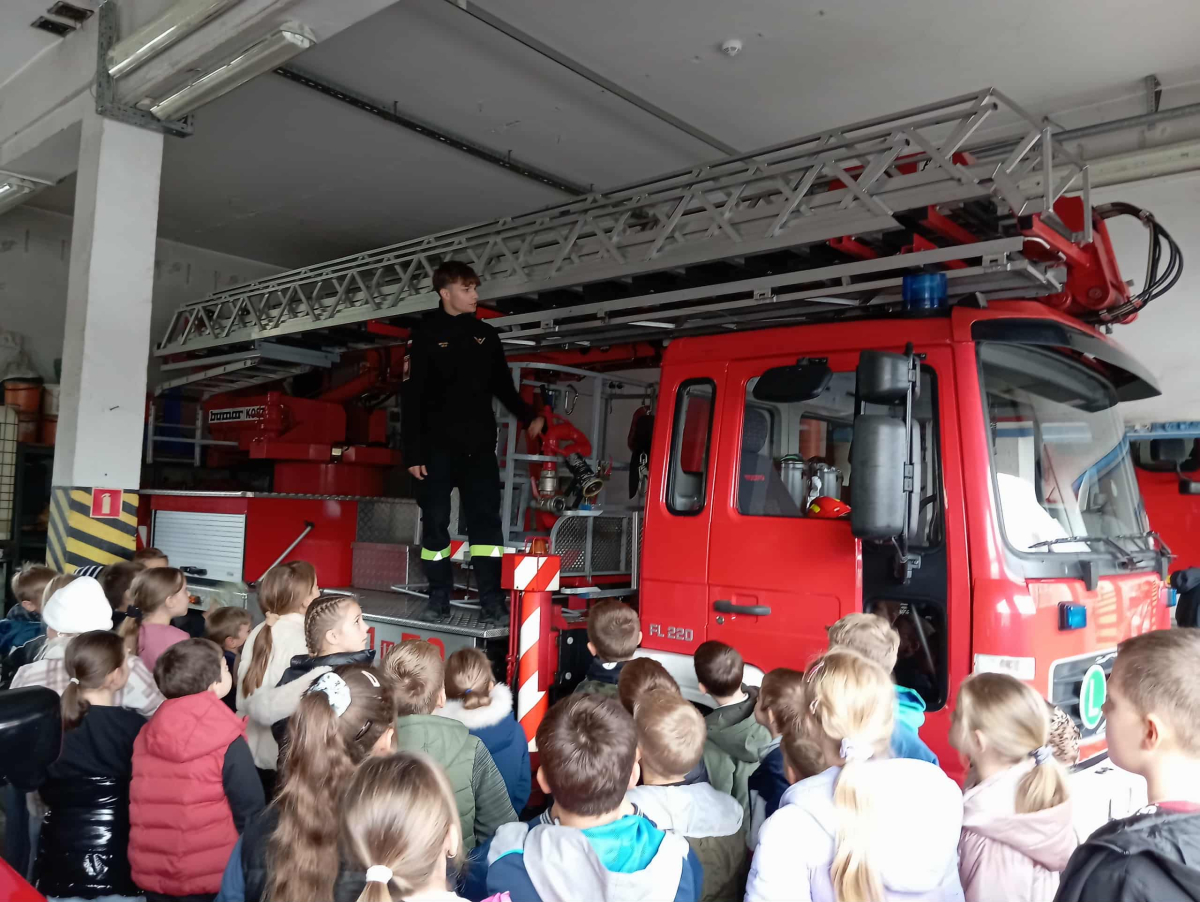Pierwszym punktem programu była wizyta w Komendzie Powiatowej Państwowej Straży Pożarnej. Dzieci z ogromnym zainteresowaniem słuchały opowieści o codziennej służbie strażaków, ich gotowości do działania i odpowiedzialności za ludzkie życie. Duże emocje wzbudził próbny alarm – uruchomienie syreny i błyskawiczna akcja strażaków pokazały, jak szybko i sprawnie potrafią reagować na zgłoszenia. Uczniowie mieli także okazję obejrzeć wozy strażackie i poznać sprzęt wykorzystywany podczas akcji ratowniczych.
