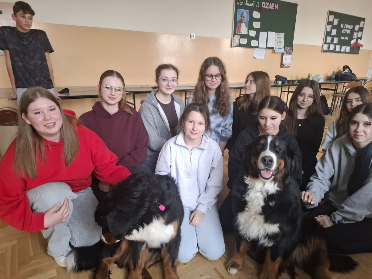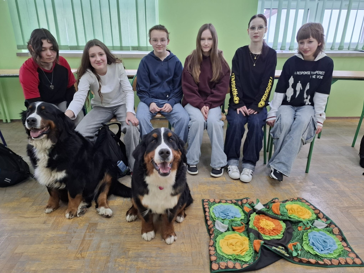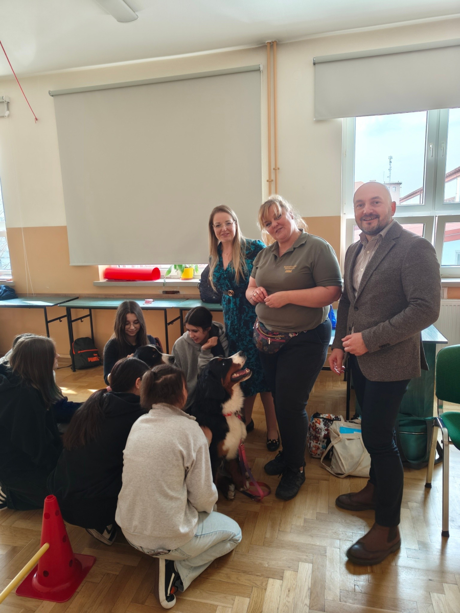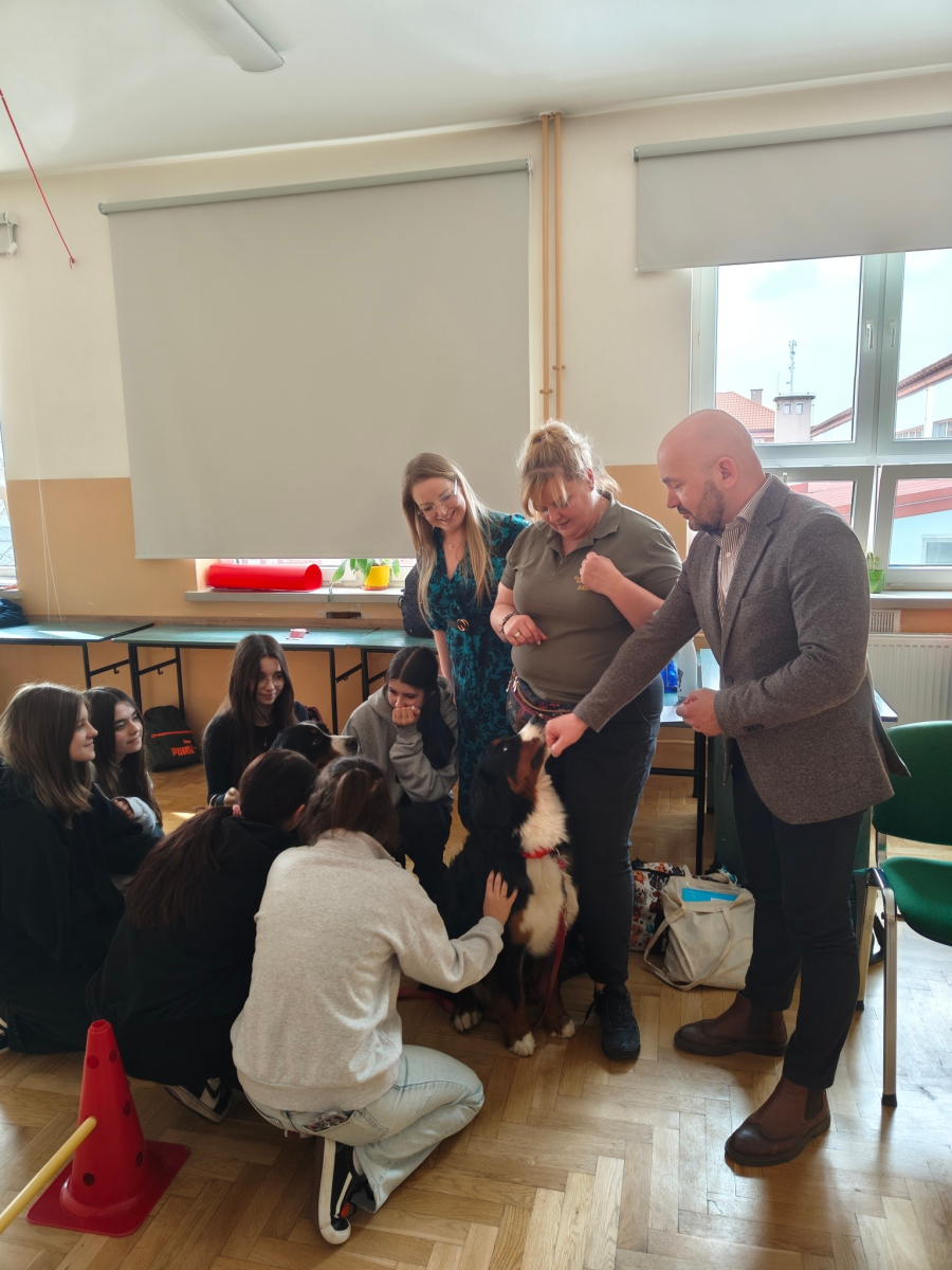 Zajęcia poprowadziła niezwykła osoba - Pani Anna Kozłowska - Psie gadu gadu - pedagog, dogoterapeuta i behawiorysta w jednym. Swoją pasją i zaangażowaniem zaraziła młodzież, która nie tylko zdobyła ważną wiedzę na temat profilaktyki uzależnień, ale również miała okazję poznać bliżej zawód dogoterapeuty.