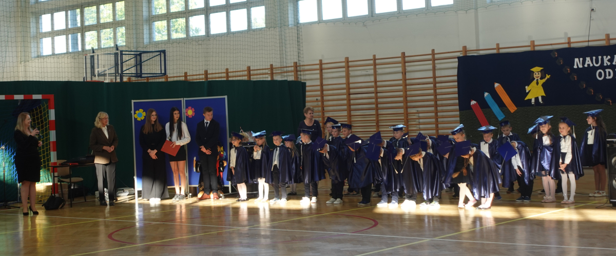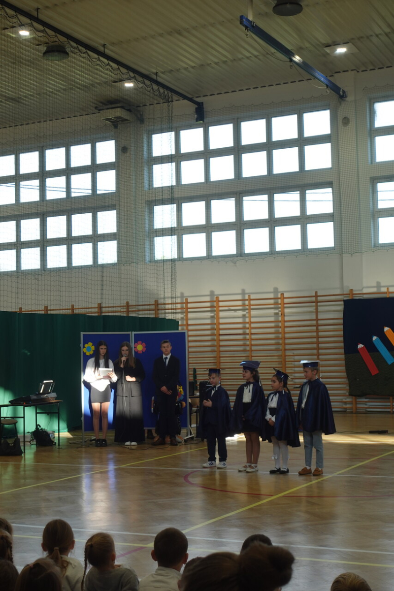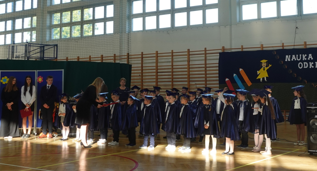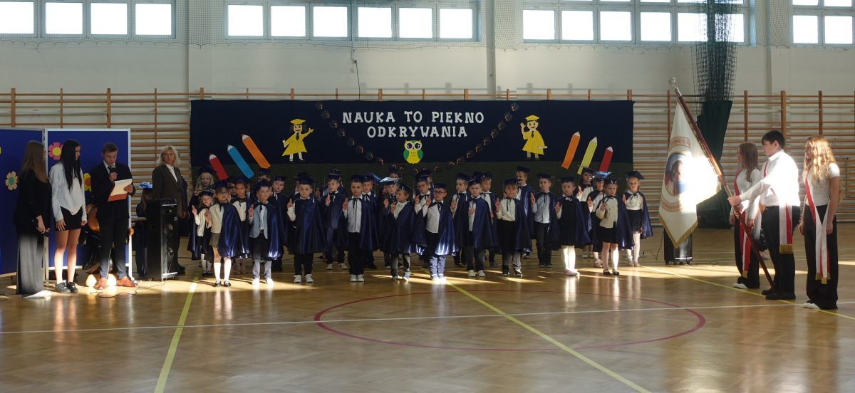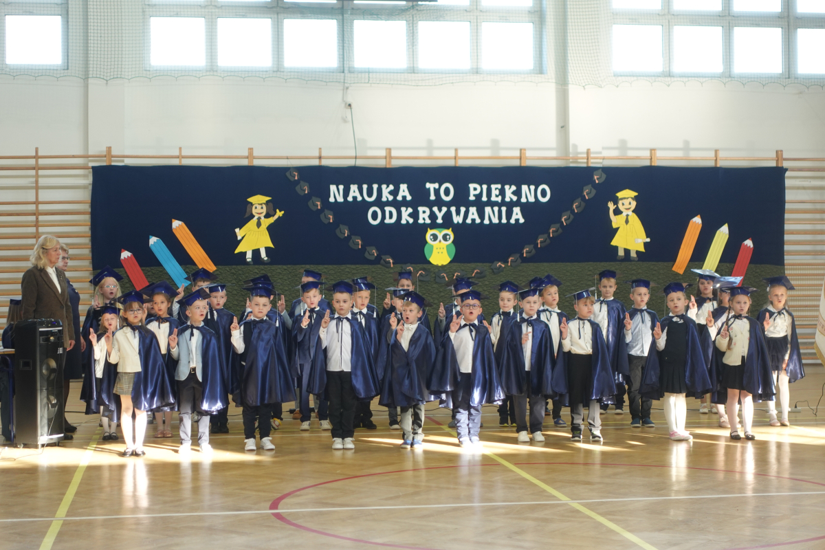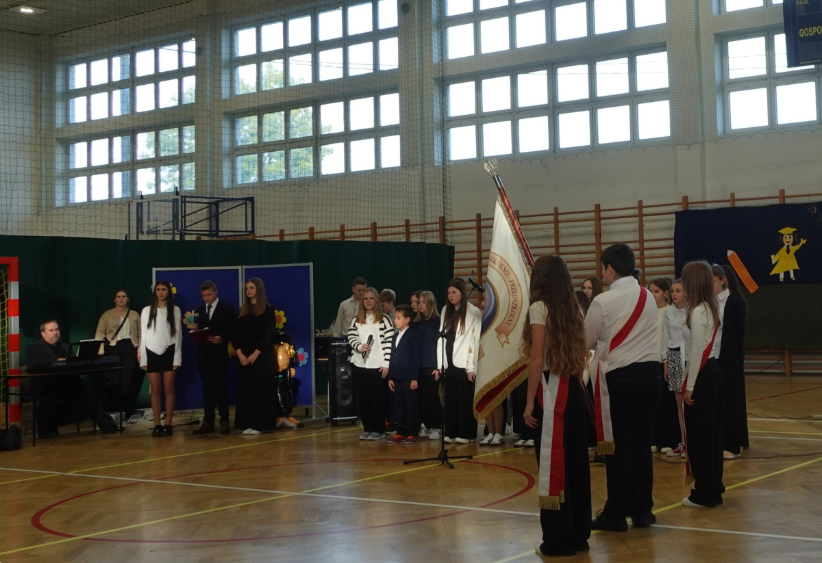 W czwartek, 16 października 2025 roku, w naszej szkole odbyła się jedna z najważniejszych uroczystości w życiu każdego ucznia – Ślubowanie klas pierwszych. To wyjątkowy dzień, w którym najmłodsi uczniowie oficjalnie zostali przyjęci do grona społeczności szkolnej. Uroczystość ta połączona była z Dniem Edukacji Narodowej. Po odśpiewaniu hymnu uczniowie z klas starszych przedstawili krótką inscenizację słowno-muzyczną.