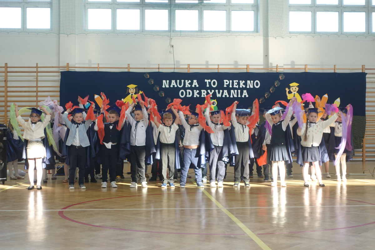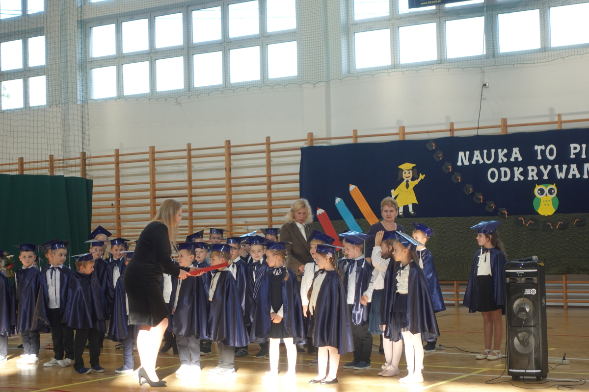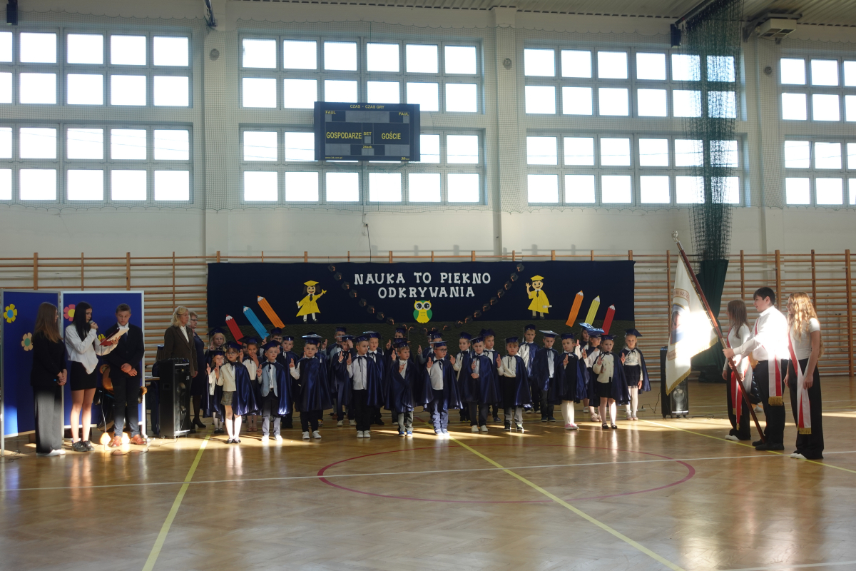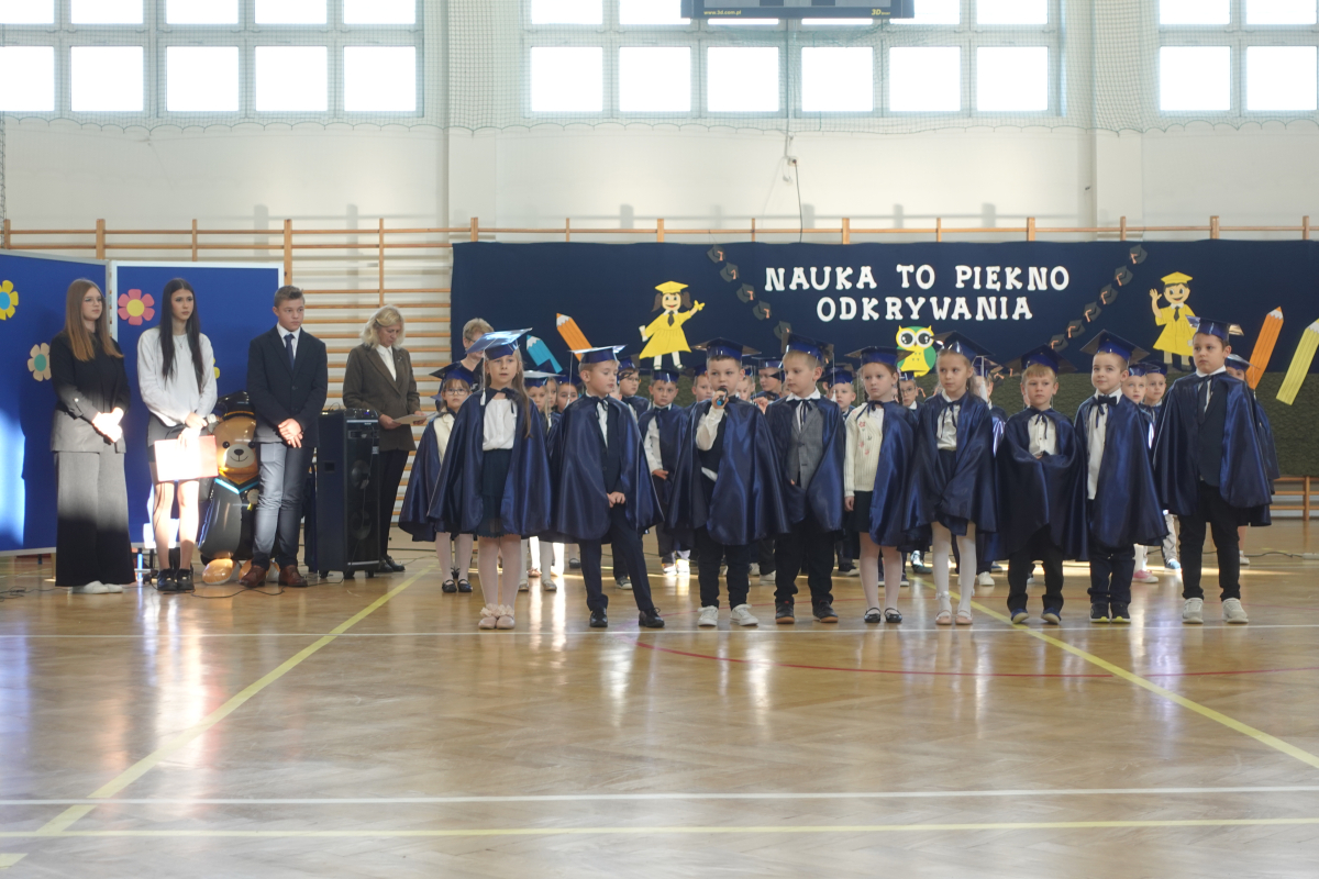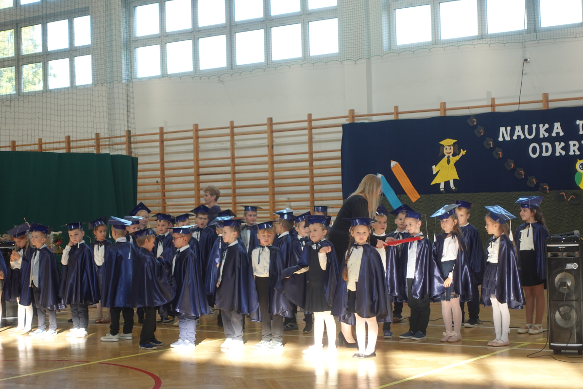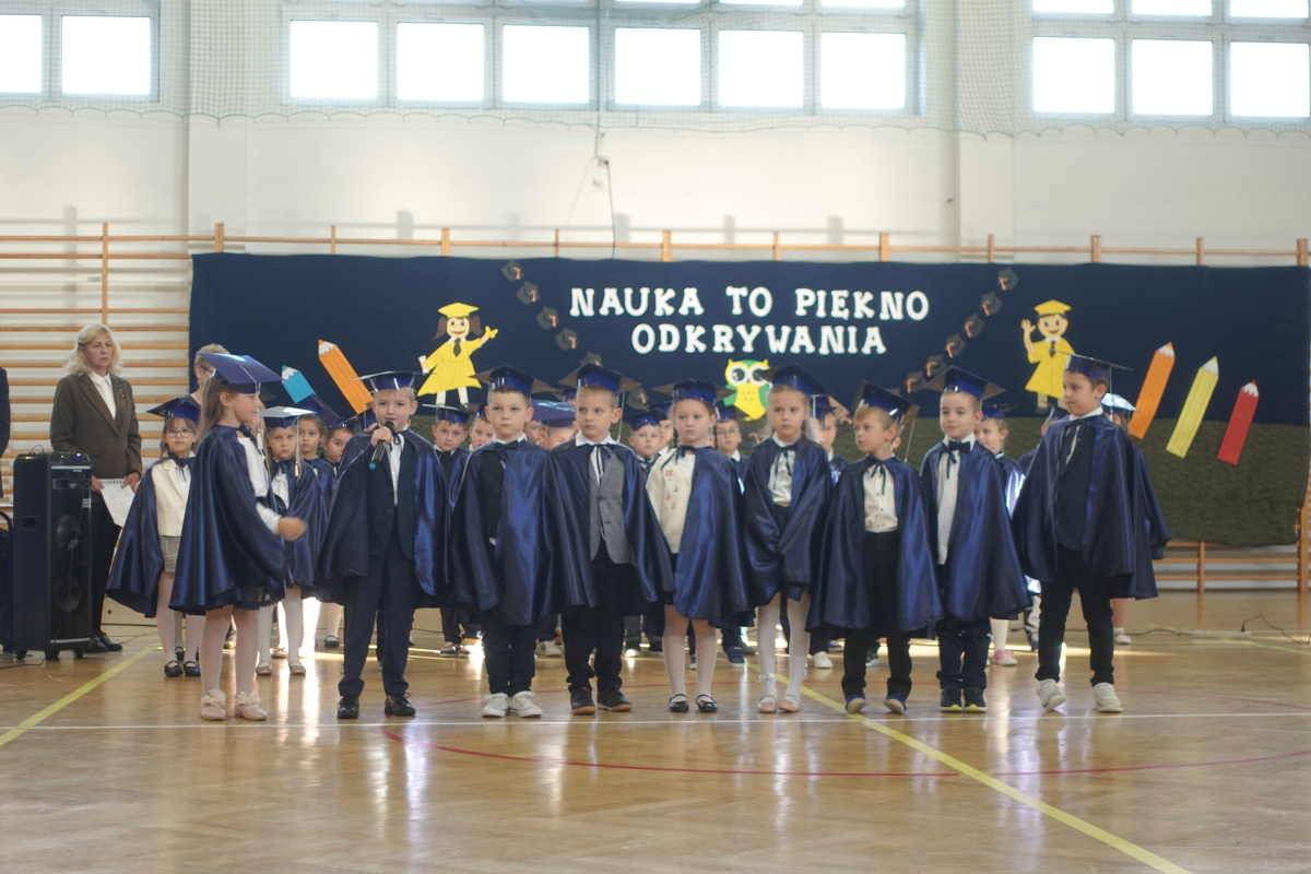 W czwartek, 16 października 2025 roku, w naszej szkole odbyła się jedna z najważniejszych uroczystości w życiu każdego ucznia – Ślubowanie klas pierwszych. To wyjątkowy dzień, w którym najmłodsi uczniowie oficjalnie zostali przyjęci do grona społeczności szkolnej. Uroczystość ta połączona była z Dniem Edukacji Narodowej. Po odśpiewaniu hymnu uczniowie z klas starszych przedstawili krótką inscenizację słowno-muzyczną.