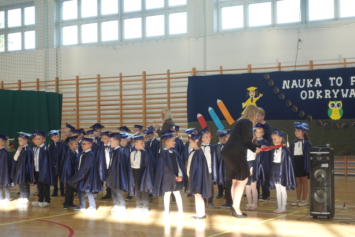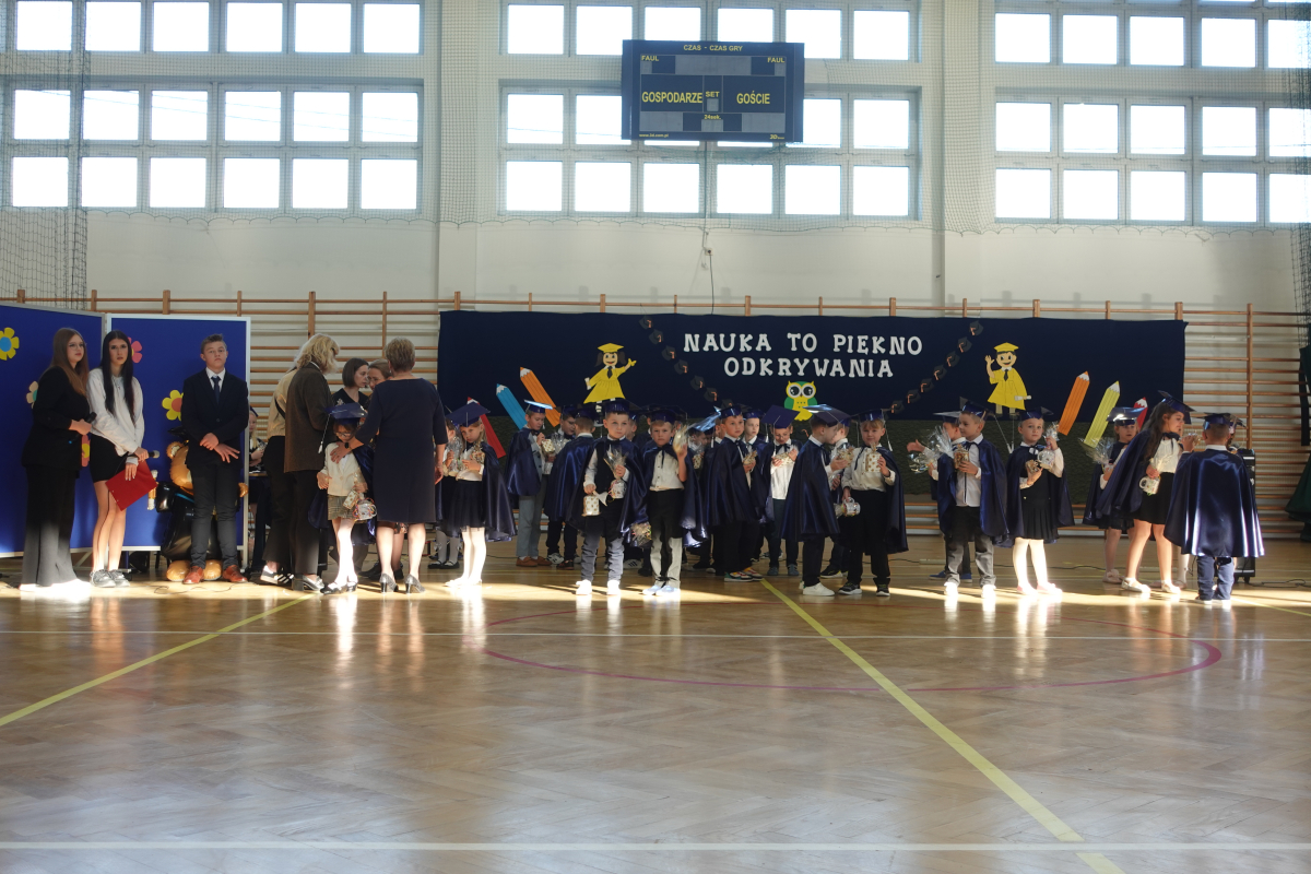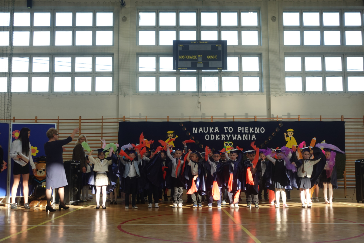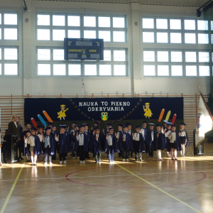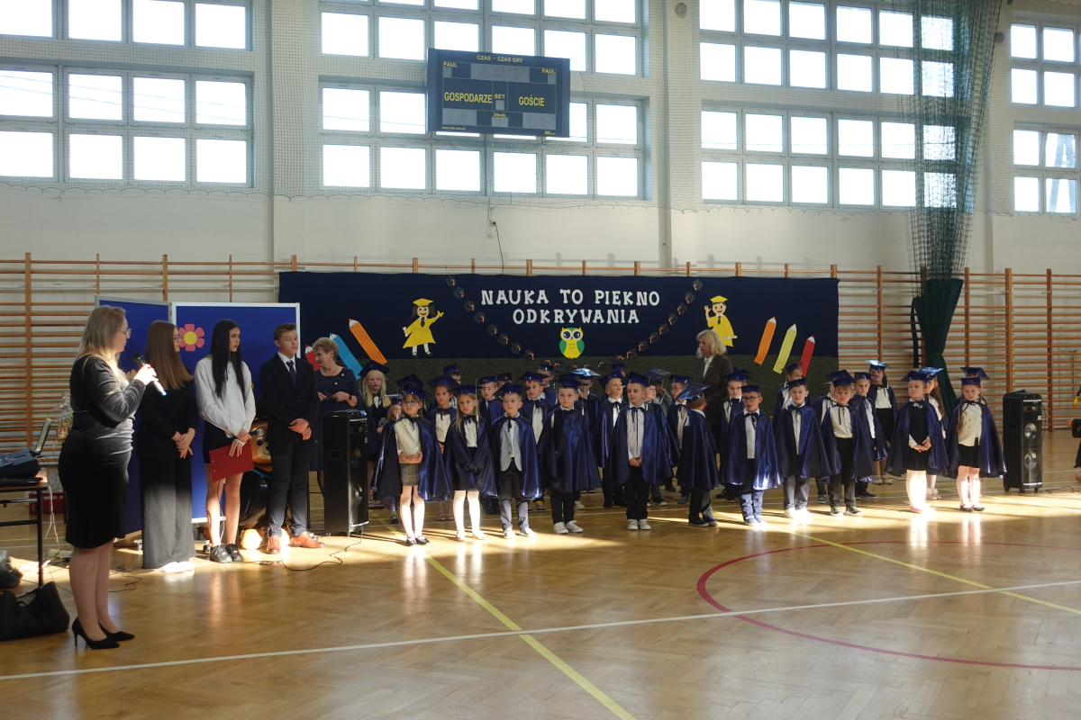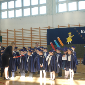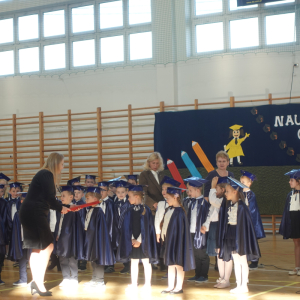 Następnie wystąpili pierwszoklasiści. Po części artystycznej, która składała się z pięknie recytowanych wierszy, piosenek i tańca, nadszedł czas na Ślubowanie i Pasowanie na uczniów. Pani Dyrektor włączyła tę liczną gromadkę do grona uczniów naszej Szkoły. Pogratulowała im i życzyła sukcesów w dalszej nauce. Życzenia złożyła również Rada Rodziców dołączając upominki.
