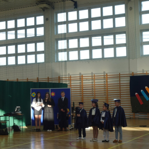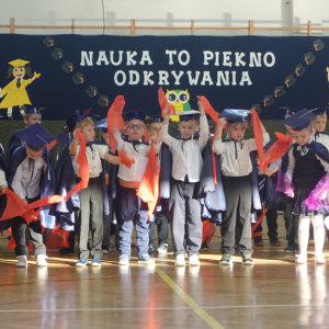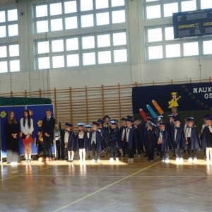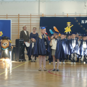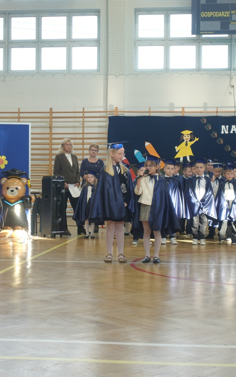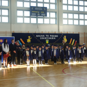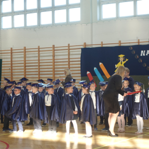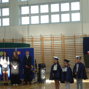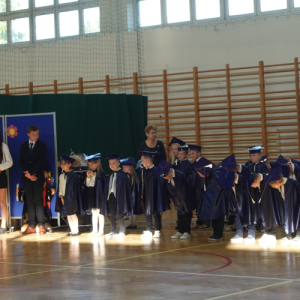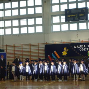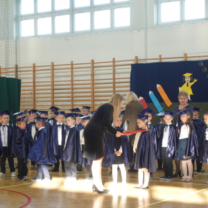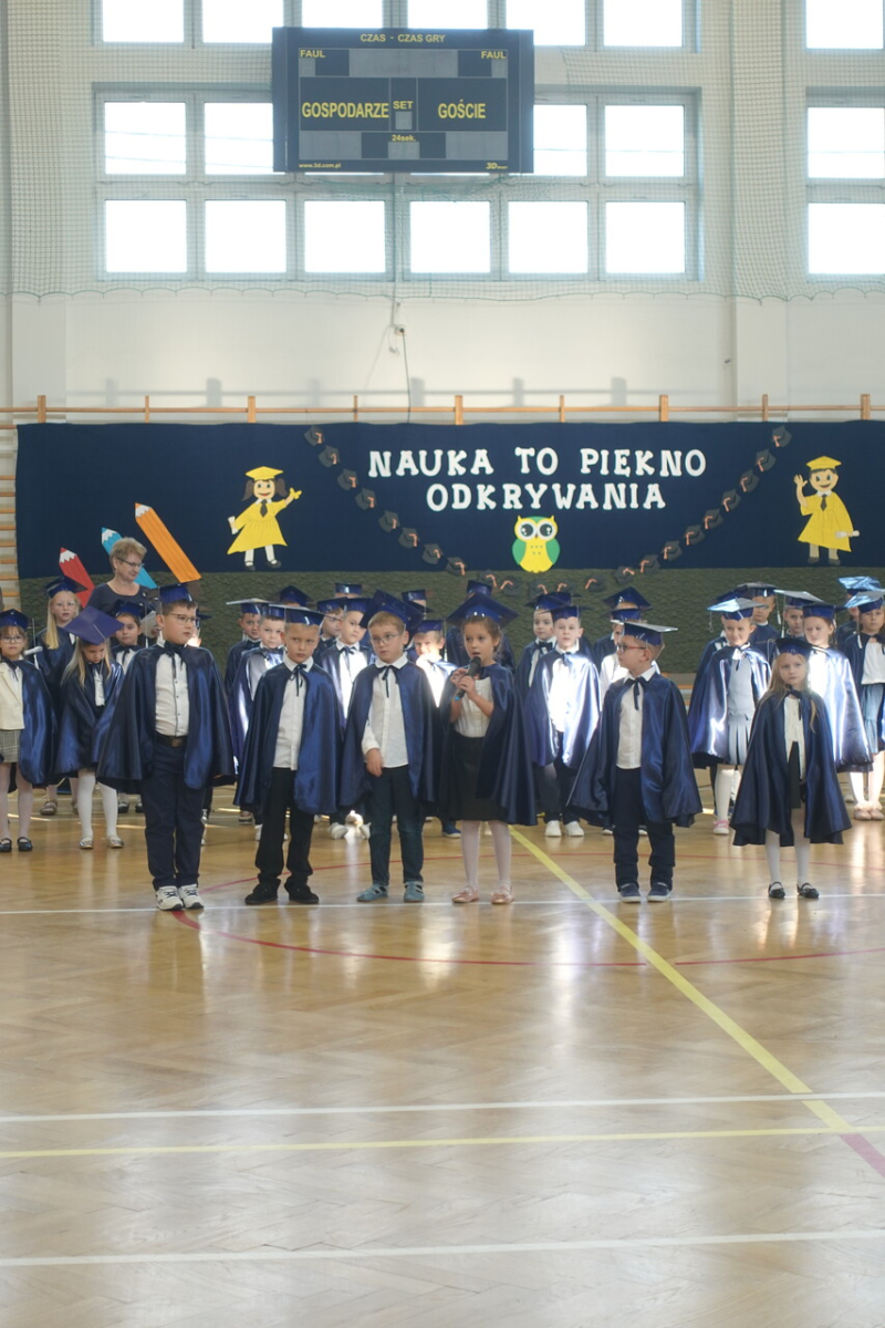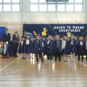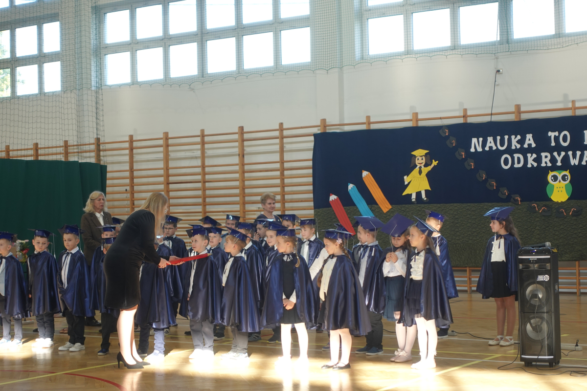 Następnie wystąpili pierwszoklasiści. Po części artystycznej, która składała się z pięknie recytowanych wierszy, piosenek i tańca, nadszedł czas na Ślubowanie i Pasowanie na uczniów. Pani Dyrektor włączyła tę liczną gromadkę do grona uczniów naszej Szkoły. Pogratulowała im i życzyła sukcesów w dalszej nauce. Życzenia złożyła również Rada Rodziców dołączając upominki.