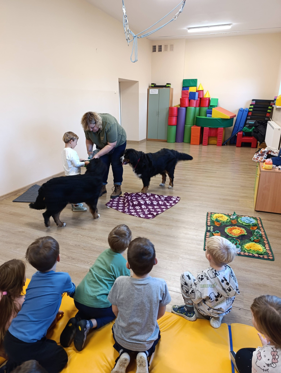 Każda z grup miała swoje spotkanie z czworonogami, dzięki czemu maluchy mogły w spokojnej atmosferze poznać zasady bezpiecznego kontaktu z psem, pogłaskać je, a nawet poćwiczyć proste polecenia.