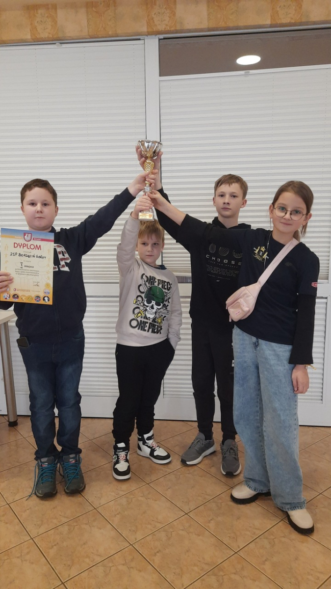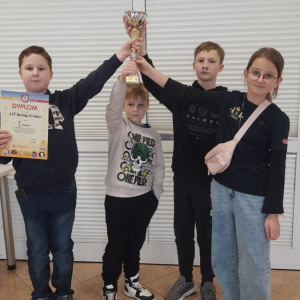 w Szachach Drużynowych. Skład drużyny: Igor Wilkosz, Weronika Jarosz, Antoni Kuras, Jan Koczwara.