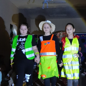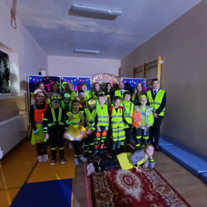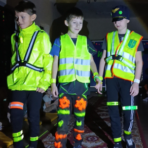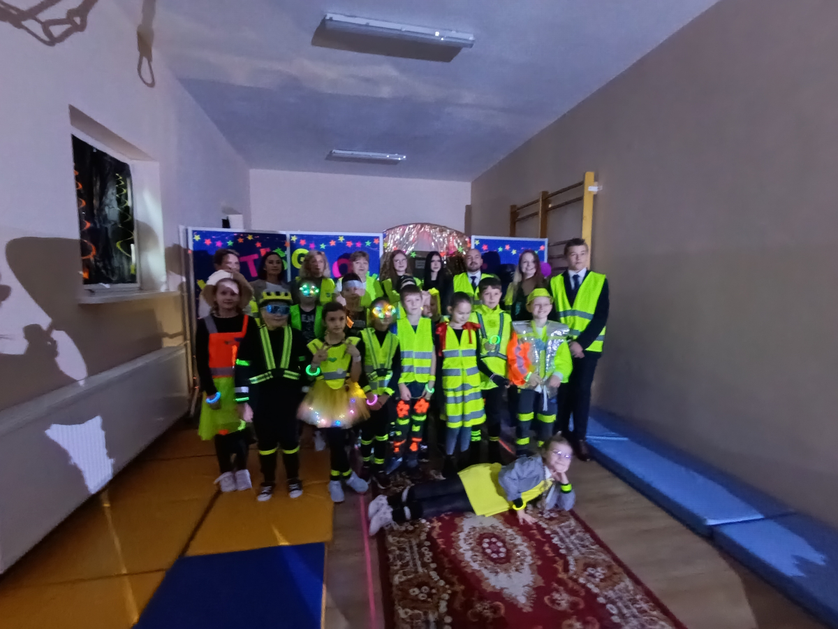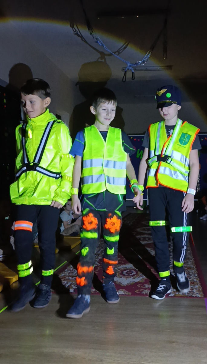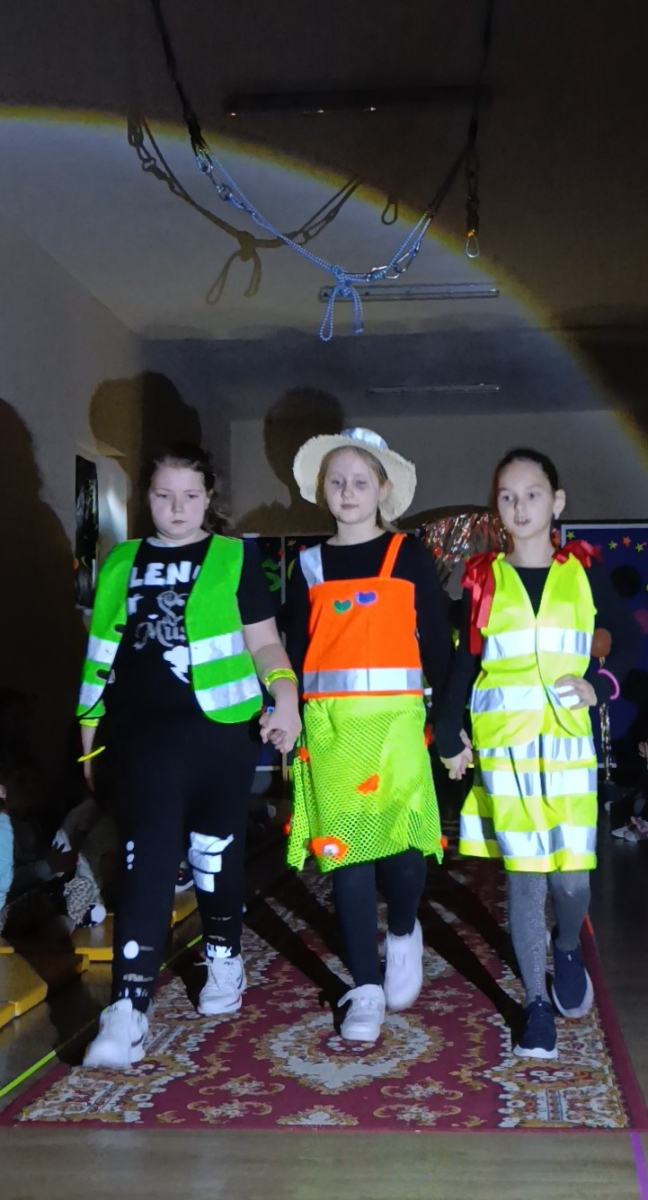 Uczniowie klasy 3b zaprezentowali odblaskowy pokaz mody, którego celem było, przypomnienie zasad bezpiecznego poruszania się po drodze. Dzieci zaprezentowały różne elementy odblaskowe i pokazały jak zwiększają one widoczność pieszych i rowerzystów. Wspólne przygotowanie odblaskowych strojów oraz występ były dla wszystkich świetną zabawą i lekcją odpowiedzialności.